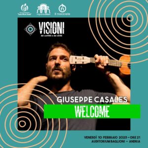 L’Ufficio Migrantes della Diocesi di Andria, in collaborazione con la Comunità Migrantesliberi e l’Ass. Culturale il Nocciolo, ha organizzato per venerdì 10 febbraio 2023, presso l’Auditorium Baglioni in Via Monte Bianco 30 ad Andria, alle ore 21:00, lo spettacolo “Welcome” di e con Beppe Casales: «“Welcome” uno spettacolo sulle migrazioni umane. Quello che ha prodotto la guerra in Siria è stato definito il più grande movimento migratorio dopo la Seconda Guerra Mondiale. Io penso che il teatro non possa non raccontarlo. Parto da Idomeni, un luogo diventato il simbolo di quello che sta succedendo da qualche anno in Europa: un movimento di uomini donne e bambini che nel cercare pace trovano un muro, un confine chiuso. Parto da Idomeni perché è stato il più grande campo profughi d’Europa. È stato la vergogna dell’Europa. Uno schiaffo alla dignità dell’uomo».