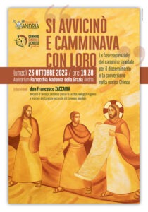L’incontro si svolgerà ad Andria lunedì 23 ottobre 2023, alle ore 19:30, presso l’auditorium della Parrocchia “Madonna della Grazia”. Interverrà don Francesco Zaccaria, docente di teologia pastorale presso la Facoltà Teologica Pugliese e membro del Comitato nazionale del Cammino sinodale.