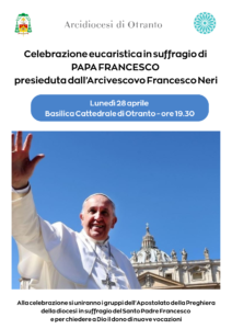 Lunedì 28 aprile, alle ore 19.30 presso la Basilica Cattedrale di Otranto, ci sarà la Celebrazione eucaristica in suffragio di PAPA FRANCESCO presieduta dall’arcivescovo Francesco Neri, alle ore 19.30.