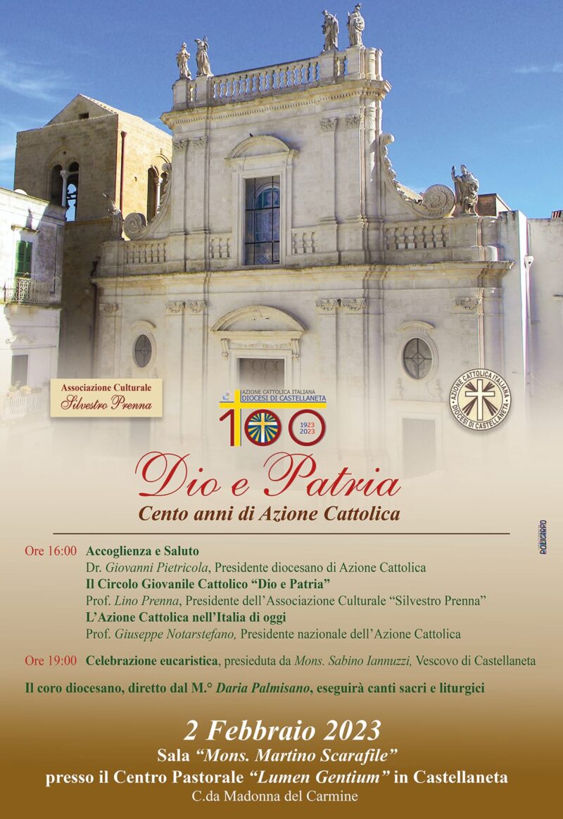 Cento anni fa, il 2 febbraio del 1923, tre giovani castellanetani, Franco Margherita, Silvestro Prenna e Vincenzo Saracino, davano vita, nella chiesa di San Michele in Castellaneta, al Circolo Giovanile “Dio e Patria”, primo nucleo dell’Azione Cattolica diocesana.
