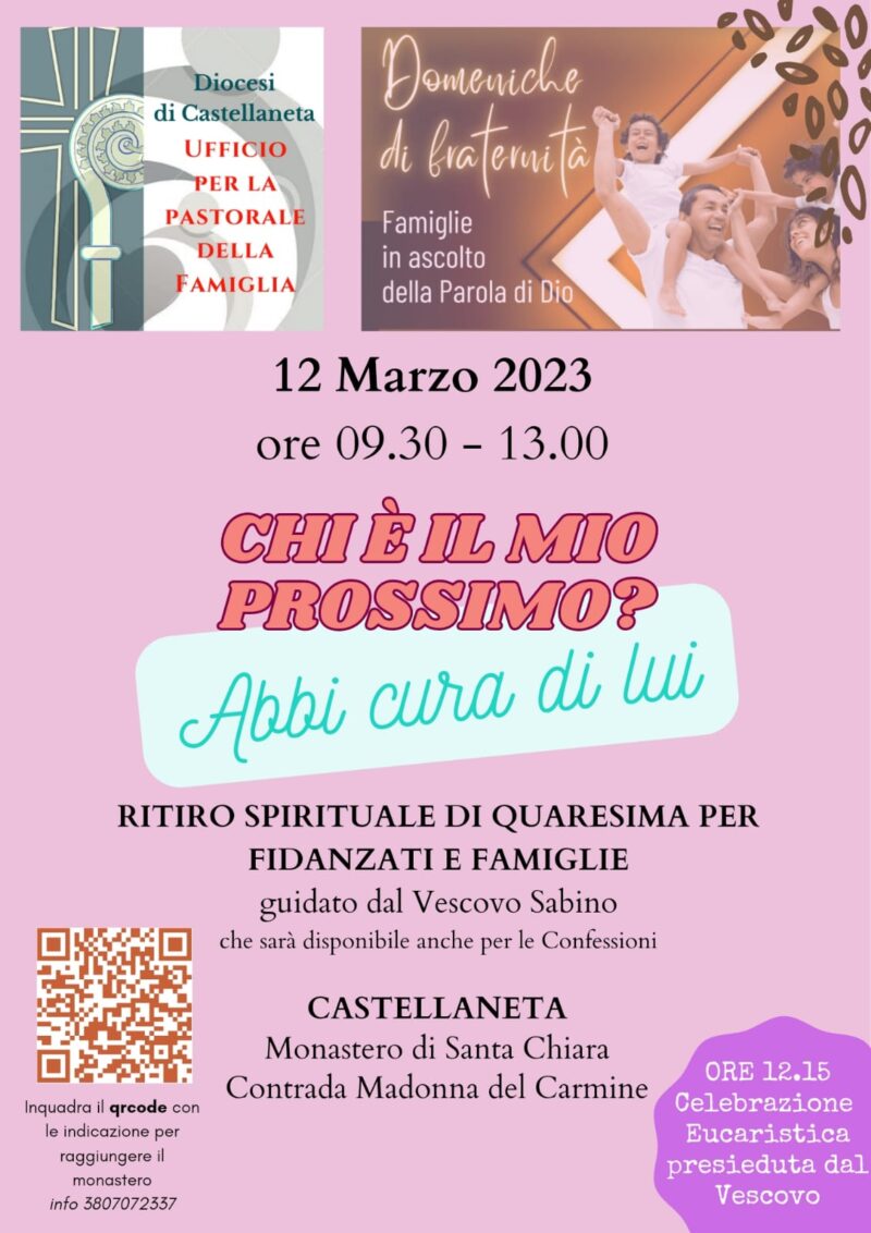 Domenica 12 Marzo 2023 dalle ore 09.30 alle ore 13.00, presso il Monastero di Santa Chiara di Castellaneta, l’Ufficio diocesano per la Pastorale della Famiglia organizza un ritiro spirituale di Quaresima per fidanzati e famiglie dal titolo “Chi è il mio prossimo? Abbi cura di lui”, guidato da Mons. Sabino Iannuzzi, che si renderà disponibile per le Confessioni.