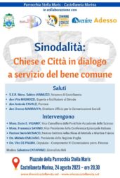 A poche settimane dall’inizio della XVI Assemblea Generale Ordinaria del Sinodo dei Vescovi, si terrà a Castellaneta Marina il prossimo 24 agosto 2023 alle 20,30 un incontro organizzato dalla Parrocchia Stella Maris sul tema “Sinodalità, Chiese e Città in dialogo a servizio del bene comune”.
