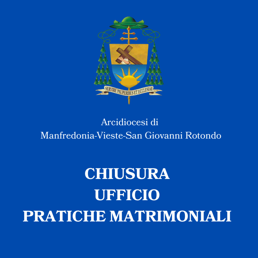 dioc. Manfredonia Chiusura Ufficio per le pratiche matrimoniali – Arcidiocesi di Manfredonia – Vieste – San Giovanni Rotondo 29 Agosto 2025 0 18 29 Agosto 2025 Si comunica che l’Ufficio per le pratiche matrimoniali resterà chiuso i seguenti giorni: lunedì 1° settembre e giovedì 4 settembre. clic qui per l’articolo sul sito diocesano ARTICOLI CORRELATIALTRO DALL'AUTORE ORDINAZIONE DI DON MICHELE COPPOLECCHIA – Arcidiocesi di Manfredonia – Vieste – San Giovanni Rotondo ORDINAZIONE PRESBITERALE DI DON ELISEO COSTANTINO – Arcidiocesi di Manfredonia – Vieste – San Giovanni Rotondo GIORNATA MONDIALE DEI POVERI – 2025 – Arcidiocesi di Manfredonia – Vieste – San Giovanni Rotondo Un voto per costruire Speranza e Fraternità – Arcidiocesi di Manfredonia – Vieste – San Giovanni Rotondo Il valore dei settimanali cattolici e la forza del giornalismo di prossimità – Arcidiocesi di Manfredonia – Vieste – San Giovanni Rotondo