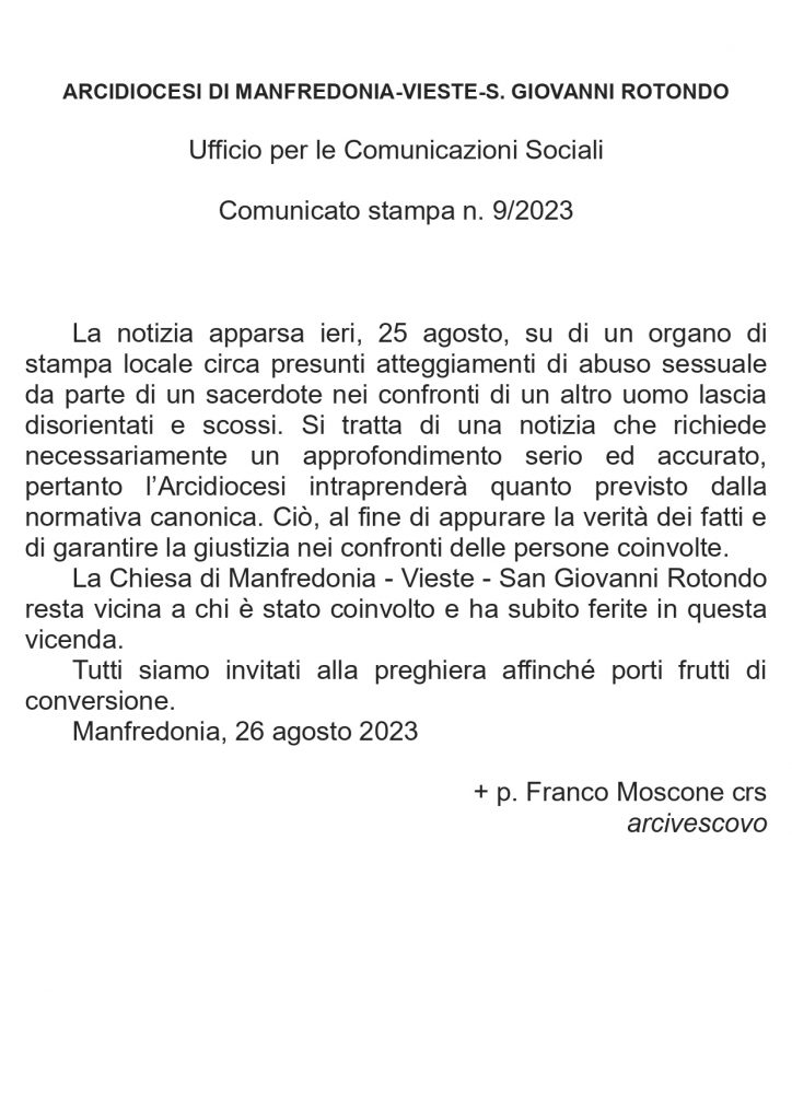 dioc. Manfredonia Comunicato stampa n. 9/2023 – Arcidiocesi di Manfredonia – Vieste – San Giovanni Rotondo 26 Agosto 2023 0 31 Comunicato stampa n. 9/2023 – Arcidiocesi di Manfredonia – Vieste – San Giovanni Rotondo Skip to content clic qui per l’articolo sul sito diocesano ARTICOLI CORRELATIALTRO DALL'AUTORE RETE INTERNAZIONALE “PRETI CONTRO IL GENOCIDIO” – Lettera aperta ai Vescovi Italiani in occasione della preghiera per la pace il giornalismo che fa vivere i settimanali diocesani – Arcidiocesi di Manfredonia – Vieste – San Giovanni Rotondo ORDINAZIONE DI DON MICHELE COPPOLECCHIA – Arcidiocesi di Manfredonia – Vieste – San Giovanni Rotondo ORDINAZIONE PRESBITERALE DI DON ELISEO COSTANTINO – Arcidiocesi di Manfredonia – Vieste – San Giovanni Rotondo GIORNATA MONDIALE DEI POVERI – 2025 – Arcidiocesi di Manfredonia – Vieste – San Giovanni Rotondo