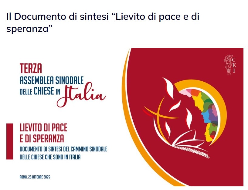 La terza Assemblea sinodale, tenutasi a Roma il 25 ottobre, ha approvato con 781 “placet” su 809 votanti il Documento di sintesi del Cammino sinodale delle Chiese che sono in Italia, dal titolo “Lievito di pace e di speranza”. Per la nostra Diocesi erano presenti il nostro Arcivescovo, Mons. Leonardo D’Ascenzo, Don Sergio Pellegrini, Sr Roberta Decleva e Domenico Paganelli. I partecipanti tra Vescovi, delegati … Continua a leggere »