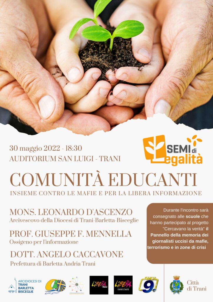 COMUNITA’ EDUCANTI CONTRO LE MAFIE. CONVEGNO A TRANI Il 30 Maggio l’auditorium della chiesa di San Luigi a Trani ospiterà l’incontro “Comunità educanti. Insieme contro le mafie per la libera informazione”, nuova iniziativa del progetto Semi di legalità promosso dal Settore Giovani dell’Azione Cattolica della Diocesi di Trani-Barletta-Bisceglie. Il Viceprefetto della BAT Dr. Angelo Caccavone, l’Arcivescovo Mons. Leonardo D’Ascenzo e con il professore Giuseppe … Continua a leggere COMUNITA’ EDUCANTI CONTRO LE MAFIE. CONVEGNO A TRANI