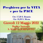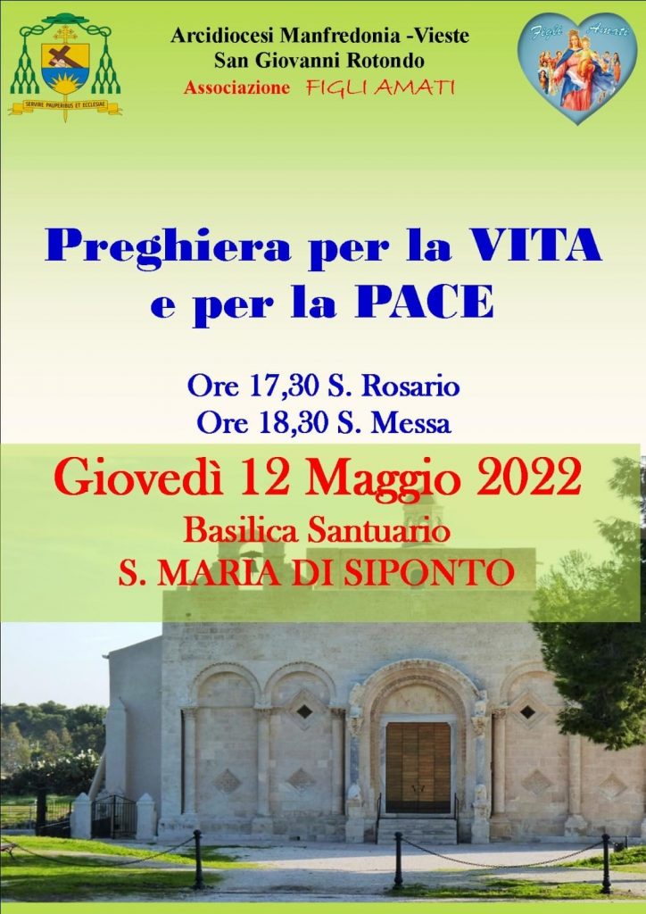 La prossima occasione di incontro e di comunione si svolgerà nella Basilica S. Maria di Siponto, giovedì 12 maggio alle ore 17.30 con la recita del Santo Rosario e alle 18.30 con la partecipazione alla Santa Messa, per la VITA e per la PACE!