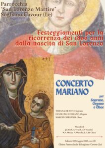Un CONCERTO MARIANO per Soprano, Organo e Oboe presso la Chiesa parrocchiale di Sogliano Cavour il 10 maggio alle ore 10.00, nei festeggiamenti per la ricorrenza dei 1800 anni dalla nascita di San Lorenzo.
