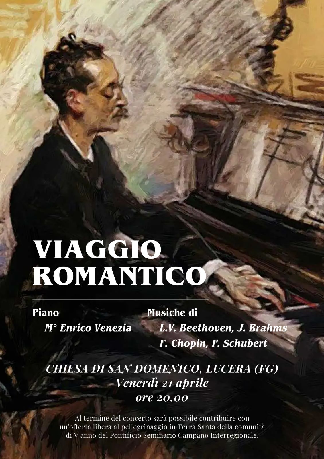 Venerdì 21 aprile 2023, alle ore 20.00, presso la Chiesa di San Domenico in Lucera, il M° Enrico Venezia terrà un concerto al piano dal titolo “Viaggio romantico”. Al termine, sarà possibile contribuire con un’offerta libera al pellegrinaggio in Terra Santa, organizzato dal Pontificio Seminario Interregionale di Posillipo per i seminaristi del V anno, al cui corso sono iscritti i condiocesani Urbano, Francesco ed Agostino.
