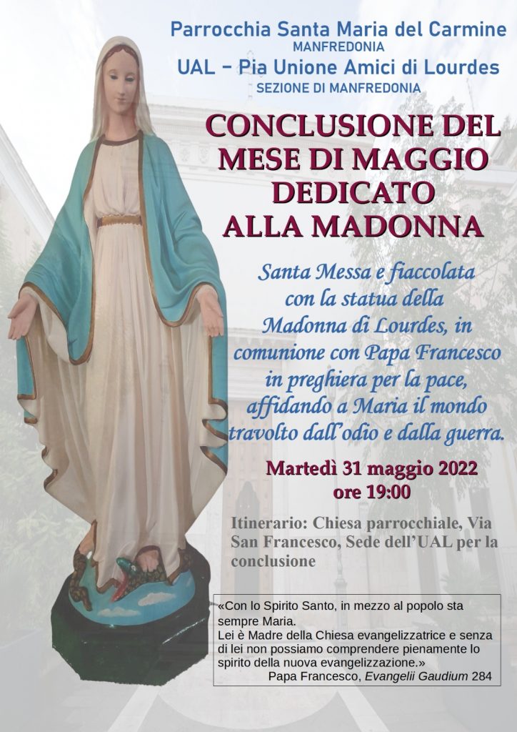 dioc. Manfredonia Conclusione del mese di maggio dedicato alla Madonna – Parrocchia Santa Maria del Carmine (Manfredonia) 27 Maggio 2022 0 31 Conclusione del mese di maggio dedicato alla Madonna – Parrocchia Santa Maria del Carmine (Manfredonia) – Arcidiocesi di Manfredonia – Vieste – San Giovanni Rotondo Skip to content clic qui per l’articolo sul sito diocesano ARTICOLI CORRELATIALTRO DALL'AUTORE ORDINAZIONE DI DON MICHELE COPPOLECCHIA – Arcidiocesi di Manfredonia – Vieste – San Giovanni Rotondo GIORNATA MONDIALE DEI POVERI – 2025 – Arcidiocesi di Manfredonia – Vieste – San Giovanni Rotondo Un voto per costruire Speranza e Fraternità – Arcidiocesi di Manfredonia – Vieste – San Giovanni Rotondo Il valore dei settimanali cattolici e la forza del giornalismo di prossimità – Arcidiocesi di Manfredonia – Vieste – San Giovanni Rotondo Ravasi inaugura l’anno accademico dell’ISSR: “Uomo, chi sei?”