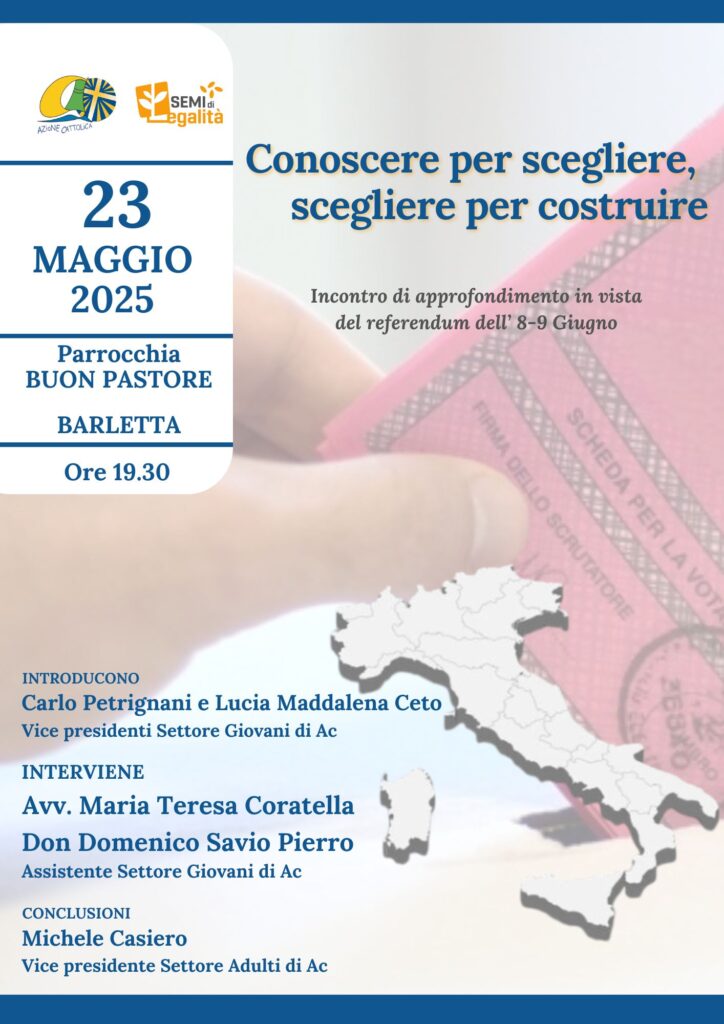 In vista dei Referendum dell’8 e 9 giugno, che riguardano temi legati al lavoro e alla cittadinanza, l’Azione Cattolica Diocesana, insieme all’Equipe del progetto Semi di Legalità, organizza un incontro aperto a tutta la comunità. L’appuntamento è per venerdì 23 maggio, alle ore 19:30, presso la parrocchia del Buon Pastore a Barletta. La serata sarà introdotta da Carlo Petrignani e Lucia Ceto, Vicepresidenti del … Continua a leggere