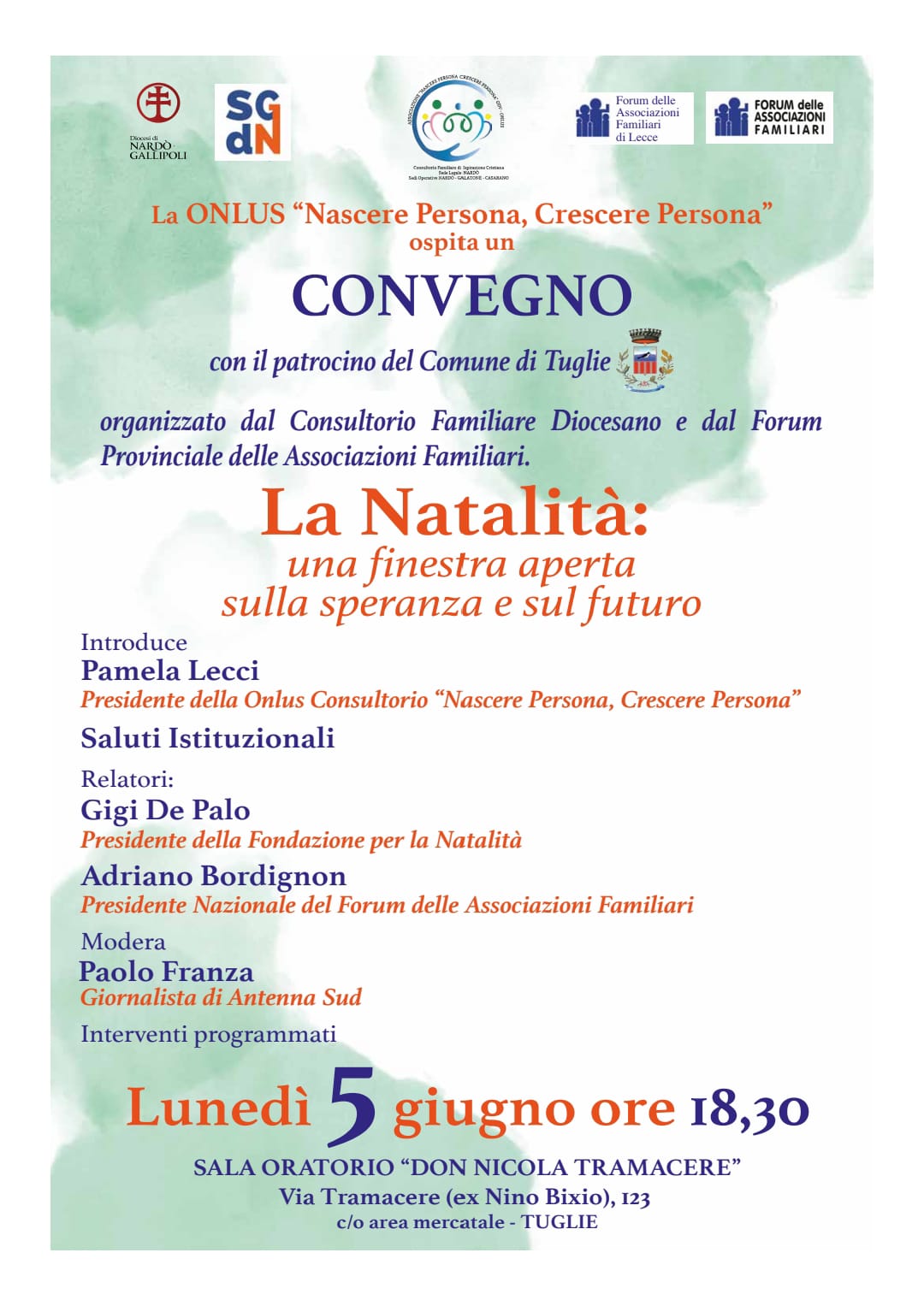 E’ indubbio che la riflessione sul tema della Natalità si pone in maniera fortemente strategica e impattante rispetto al futuro del nostro paese; per questo il Consultorio diocesano “Nascere persona, Crescere persona” insieme al Forum Provinciale delle Associazioni Familiari organizza un Convegno dal titolo “La Natalità: una finestra aperta sulla speranza e sul futuro”.