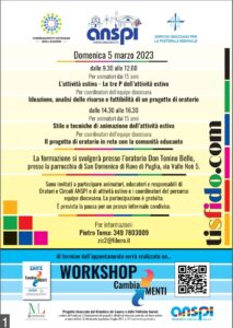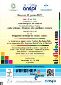 Il servizio di pastorale giovanile in collaborazione con l’ANSPI diocesana continua il percorso di formazione e supporto per gli oratori della diocesi, già attivato negli ultimi anni. Il percorso formativo sarà distribuito in due appuntamenti: il primo domenica 22 gennaio, il secondo Domenica 5 marzo. Gli incontri si svolgeranno, dalle 9.30 alle 16.30, presso l’Oratorio ANSPI Don Tonino Bello della parrocchia di San Domenico in Ruvo, via Valle Noè 5.