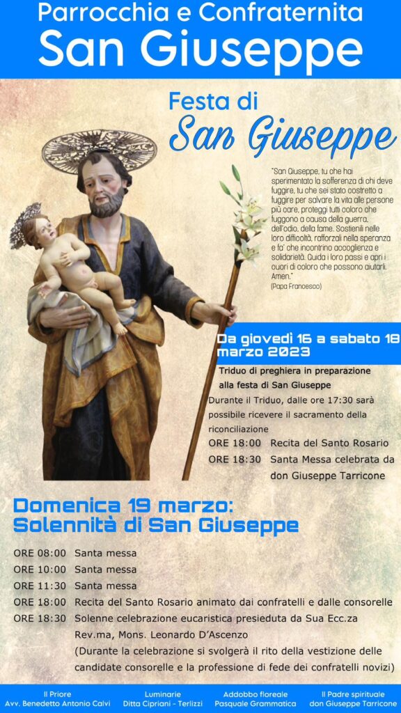dioc. Trani CORATO. LA FESTA DI SAN GIUSEPPE 14 Marzo 2023 0 37 clic qui per l’articolo sul sito della Diocesi di Trani-Bisceglie-Barletta ARTICOLI CORRELATIALTRO DALL'AUTORE GIORNATA PRO ORANTIBUS – MONASTERO SAN RUGGIERO INCONTRO DI CLERO ZONA PASTORALE TRANI “SAN NICOLA PELLEGRINO” Giovedì 20 novembre 2025 PDF: I CONTENUTI DEL PRIMO INCONTRO – Prof. Pier Cesare RIVOLTELLA Prof. Pier Cesare RIVOLTELLA – PRIMA SESSIONE INCONTRO DIOCESANO A CORATO UN INCONTRO SULLA LIBERTA’ DI STAMPA – Un diritto da conoscere, difendere e onorare – Per giornalisti e per l’intero pubblico