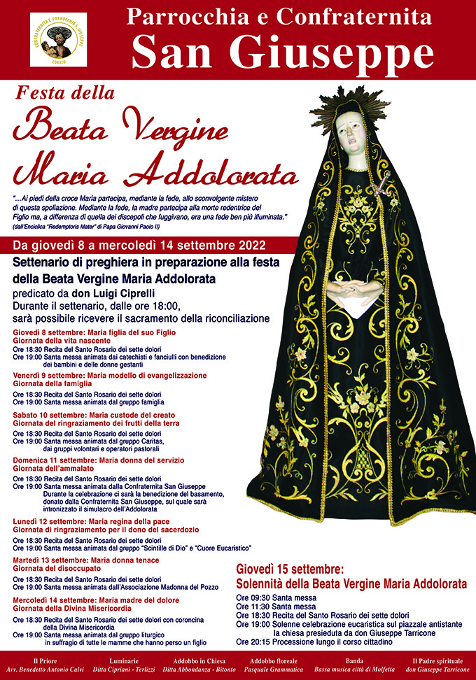 dioc. Trani CORATO. SOLENNITA’ DELLA BEATA VERGINE MARIA ADDOLORATA 3 Settembre 2022 0 29 clic qui per l’articolo sul sito della Diocesi di Trani-Bisceglie-Barletta ARTICOLI CORRELATIALTRO DALL'AUTORE GIORNATA PRO ORANTIBUS – MONASTERO SAN RUGGIERO INCONTRO DI CLERO ZONA PASTORALE TRANI “SAN NICOLA PELLEGRINO” Giovedì 20 novembre 2025 PDF: I CONTENUTI DEL PRIMO INCONTRO – Prof. Pier Cesare RIVOLTELLA Prof. Pier Cesare RIVOLTELLA – PRIMA SESSIONE INCONTRO DIOCESANO A CORATO UN INCONTRO SULLA LIBERTA’ DI STAMPA – Un diritto da conoscere, difendere e onorare – Per giornalisti e per l’intero pubblico