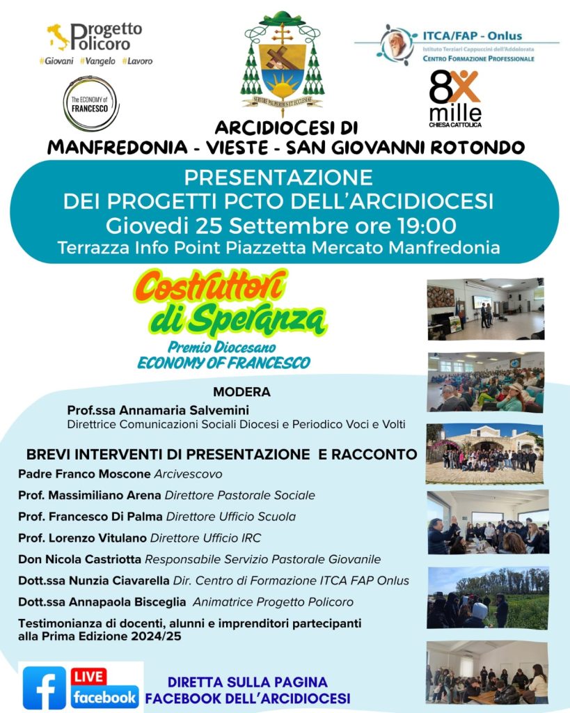 Per il secondo anno consecutivo l’Arcidiocesi propone alle Scuole Secondarie di 2° Grado un Bando sulla capacità di progettazione di impresa secondo i principi dell’Economy of Francesco con relativi percorsi PCTO.