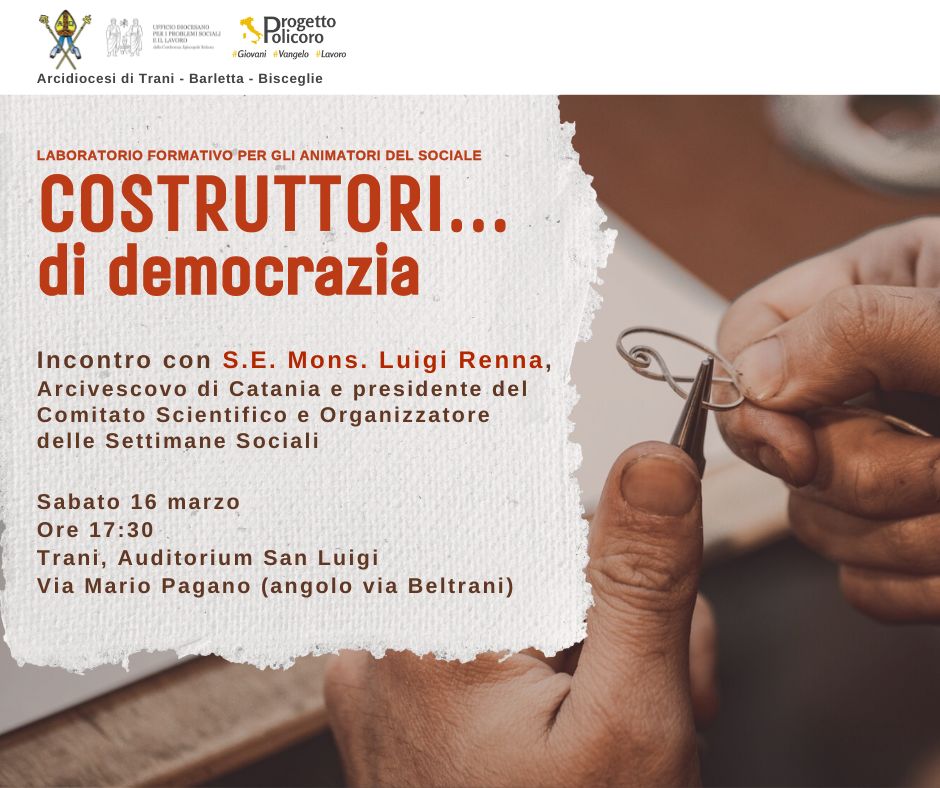 COSTRUTTORI…di democrazia Si terrà Sabato 16 Marzo alle ore 17:30, presso l’Auditorium San Luigi in Trani, il secondo appuntamento del Laboratorio Formativo per gli Animatori del Sociale organizzato dall’Ufficio Diocesano di Pastorale Sociale e del Lavoro. L’incontro vedrà la presenza di S.E. Mons. Luigi Renna, Arcivescovo di Catania e Presidente del Comitato Scientifico ed organizzatore delle Settimane Sociali, il quale presenterà ufficialmente nella nostra Arcidiocesi … Continua a leggere