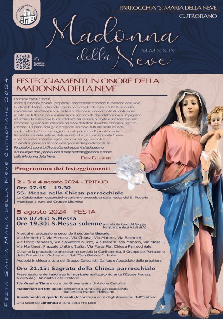 È tutto pronto a Cutrofiano per le celebrazioni in onore della Madonna della Neve. Si tratta, spiega don Emanuele Vincenti, della “festa di tutta la comunità: un’occasione per chiedere alla Vergine aiuto e protezione, ma anche un’opportunità di condivisione e unità per tutti i gruppi e le associazioni parrocchiali, che collaborano e si impegnano ad offrire il loro servizio e la loro creatività per rendere più bella e partecipata questa ricorrenza”.