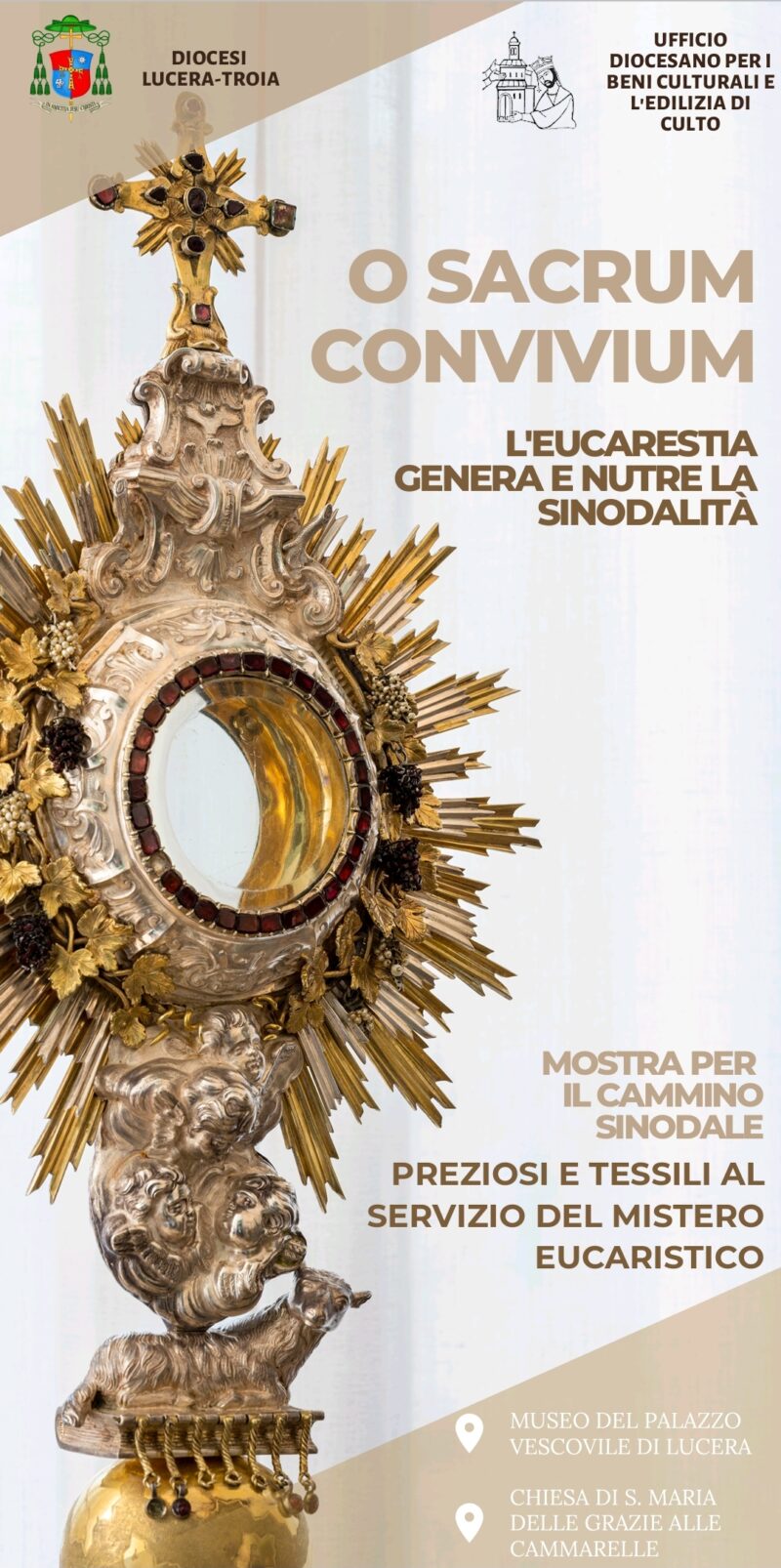 La mostra è stata allestita nel Museo del Palazzo Vescovile di Lucera e nella Chiesa di S. Maria delle Grazie alle Camarelle. L’allestimento di quest’anno, sul solco della tradizione che il predetto Ufficio da sempre organizza per il ferragosto lucerino, ha per tema l’Eucaristia “fonte e culmine” non solo della vita della Chiesa ma anche del cammino di comunione “nella” Chiesa. Questo attraverso le suppellettili e i tessili preziosi della diocesi che hanno espresso la vita eucaristica dei nostri padri. “L’Eucaristia accoglie e ospita tutti, unifica le differenze, fa incontrare le generazioni e invia tutti. Genera e nutre la sinodalità. Nell’Eucaristia il Sinodo trova il suo apice” (Mons. G. Dianin).