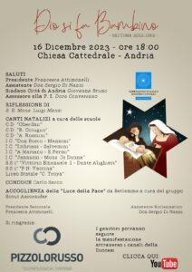 Sabato 16 dicembre 2023, nella chiesa Cattedrale di Andria, alle ore 18:00 si svolgerà la settima edizione della manifestazione “Dio si fa bambino”, organizzata dall’Associazione Italiana Maestri Cattolici di Andria.