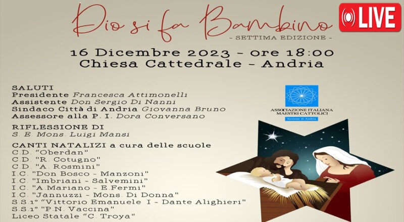 dioc. Andria Dio si fa bambino 15 Dicembre 2023 0 38 https://www.youtube.com/live/NLV844MNVEs?si=p8swk8YB2IkyBO9C clic qui per l’articolo sul sito diocesano della Diocesi di Andria ARTICOLI CORRELATIALTRO DALL'AUTORE Giubileo Diocesano dei Musicisti e dei cantori Incontro con Mons. Armando MATTEO LETTERA APERTA ALLA CITTÀ – Diocesi di Andria Appello del Vescovo – Diocesi di Andria “come astri nel mondo” – Diocesi di Andria