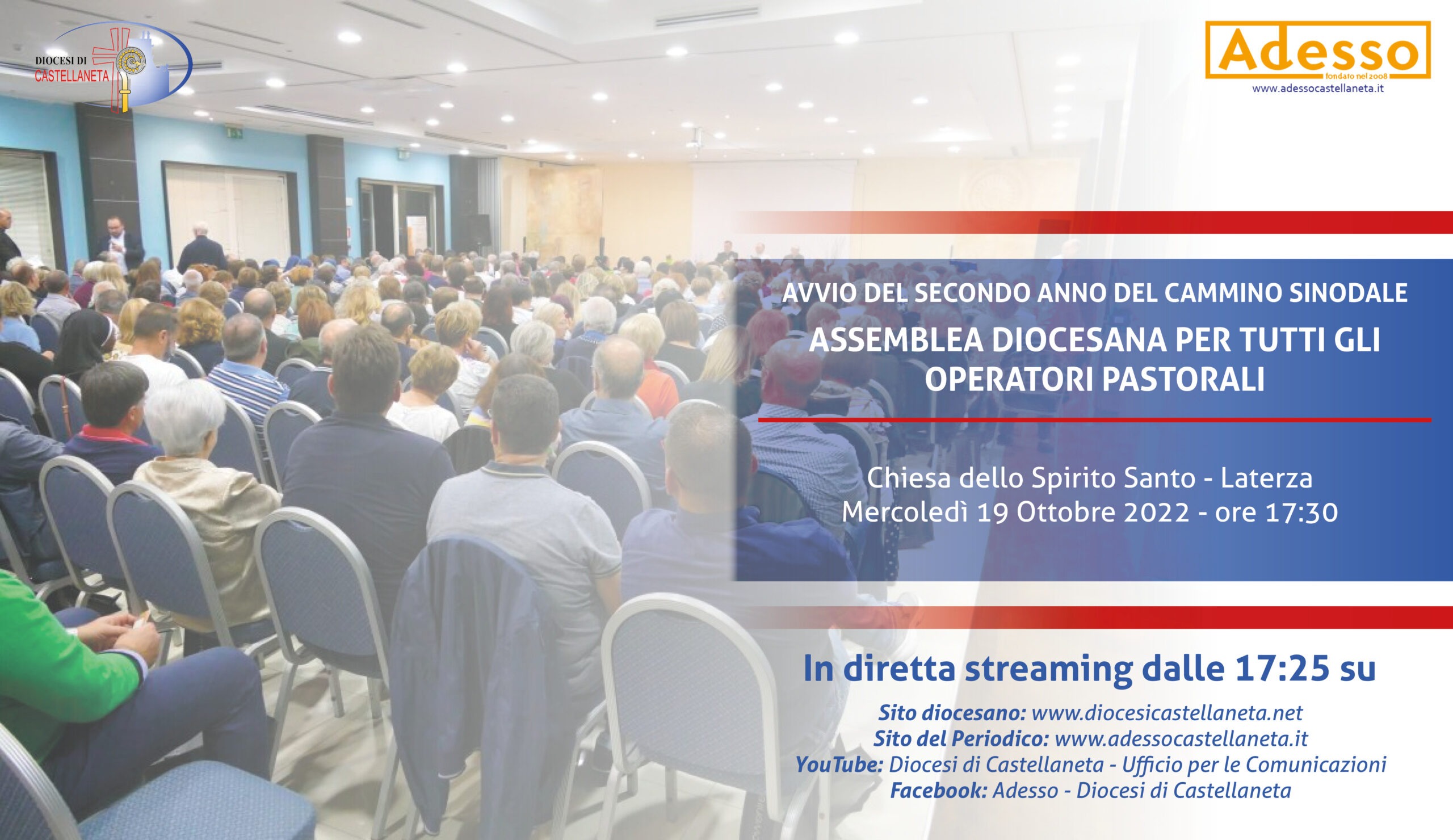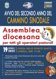 Mercoledì 19 Ottobre 2022 alle ore 17:30 presso la Chiesa dello Spirito Santo in Laterza si svolgerà l’Assemblea diocesana per tutti gli operatori pastorali.