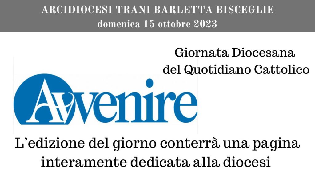 DOMENICA 15 OTTOBRE LA GIORNATA DIOCESANA DI AVVENIRE Domenica  15 ottobre l’Arcidiocesi di Tran-Barletta-Bisceglie vivrà la Giornata diocesana del quotidiano cattolico “Avvenire”. L’edizione del giorno conterrà un’intera pagina tutta dedicata alla diocesi. «Diventa per me naturale  e nel contempo accorato l’invito alla lettura del nostro quotidiano Avvenire – – scrive l’Arcivescovo nel suo messaggio contenuto nella pagina diocesana -. Esso, grazie all’apporto di giornalisti altamente … Continua a leggere DOMENICA 15 OTTOBRE LA GIORNATA DIOCESANA DI AVVENIRE »
