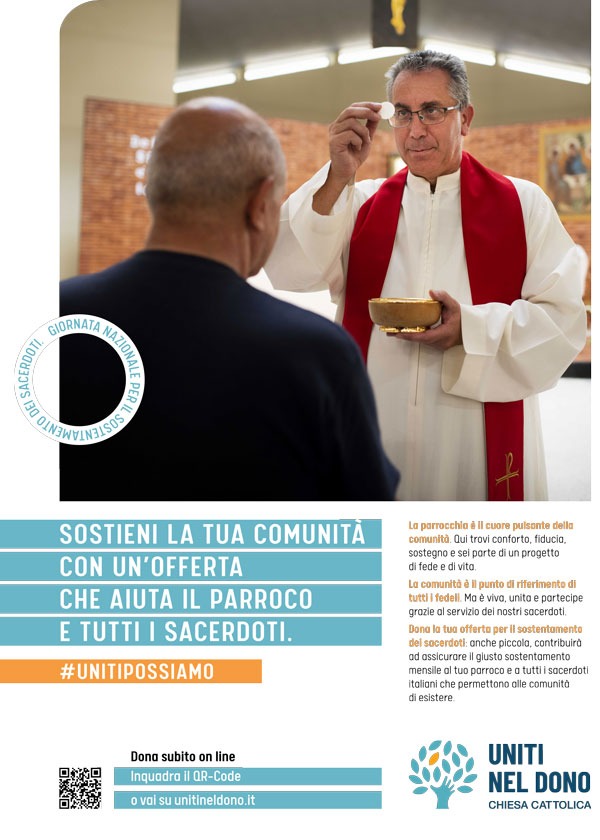 Domenica 18 settembre 2022 XXXIV Giornata nazionale delle offerte per il sostentamento dei sacerdoti I nostri preti sono sempre al nostro fianco ma anche noi possiamo far sentire loro la nostra presenza. Ogni giorno ci offrono il loro tempo, ascoltano le nostre difficoltà e incoraggiano percorsi di ripresa: sono i nostri sacerdoti che si affidano alla generosità dei fedeli per essere liberi di servire … Continua a leggere Domenica 18 settembre 2022 XXXIV Giornata nazionale delle offerte per il sostentamento dei sacerdoti