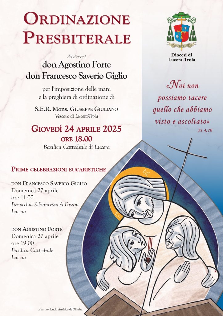Il rito avverrà per l’imposizione delle mani e la preghiera di ordinazione di S.E.R. Mons. Giuseppe Giuliano, vescovo di Lucera-Troia, giovedì 24 aprile 2025, alle ore 18.00, presso la Basilica Cattedrale di Lucera.