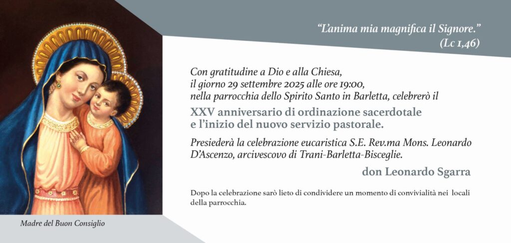 Lunedì 29 settembre 2025, a Barletta, nella parrocchia Spirito Santo, alle ore 19.00, don Leonardo Sgarra renderà il suo grazie al Signore durante la solenne celebrazione eucaristica presieduta in occasione del 25° anniversario della sua ordinazione presbiterale e dell’inizio del suo nuovo servizio pastorale come parroco. Don Leonardo Sgarra  è nato a Barletta il 6 agosto 1974. Ha ricevuto il battesimo l’8 settembre dello … Continua a leggere »