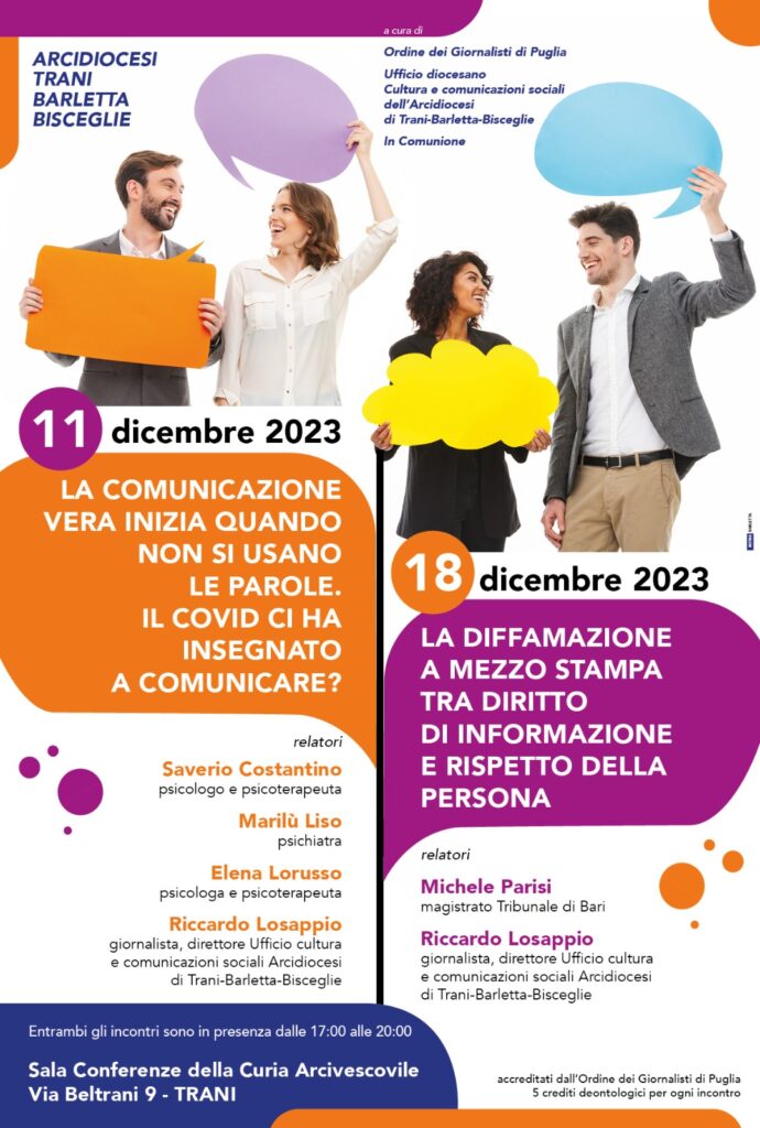 DUE EVENTI FORMATIVI PER I GIORNALISTI SUL POST COVID E SULLA DIFFAMAZIONE L’Ufficio cultura e comunicazioni sociali dell’arcidiocesi per aggiornare gli operatori della comunicazione. Riprendono gli eventi di aggiornamento per i giornalisti presso la sala diocesana. L’avvento di internet e dei social network ha mutato radicalmente la fruizione dell’informazione e dell’uso delle varie piattaforme: i media tradizionali hanno lasciato spazio alle piattaforme algoritmiche, … Continua a leggere