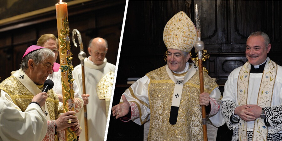 La Veglia si è aperta fuori dal portone centrale della cattedrale con la liturgia del fuoco benedetto dall’arcivescovo cui ha poi acceso l’artistico cero pasquale fatto decorare con maestria dal parroco della cattedrale e riportante tutti i simboli pasquali e gli stemmi dell’arcivescovo e del Capitolo Cattedrale. È seguito il canto solenne dell’Exultet e la liturgia della Parola fino al canto del Gloria e alla proclamazione del vangelo della resurrezione.