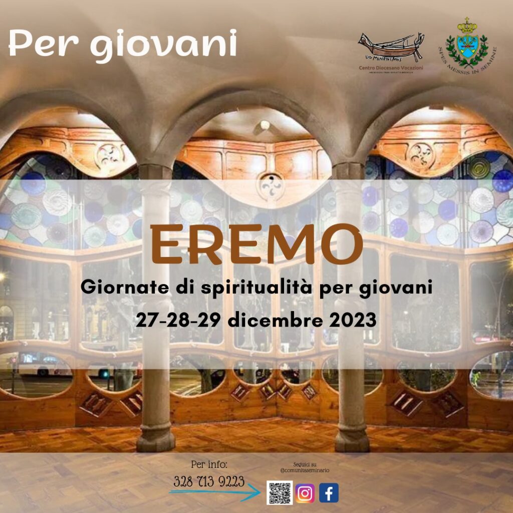 EREMO è una iniziativa del Centro diocesano vocazioni che propone tre giornate residenziali di spiritualità. La proposta è indirizzata ai giovani (18+) che desiderano entrare più a fondo nella vita spirituale e vivere insieme ad altri giovani. 27-28-29 dicembre (da pranzo a pranzo) presso il Seminario diocesano “d. Pasquale Uva” in Bisceglie. Per iscriversi si può compilare direttamente il Google form o chiamare il numero … Continua a leggere »