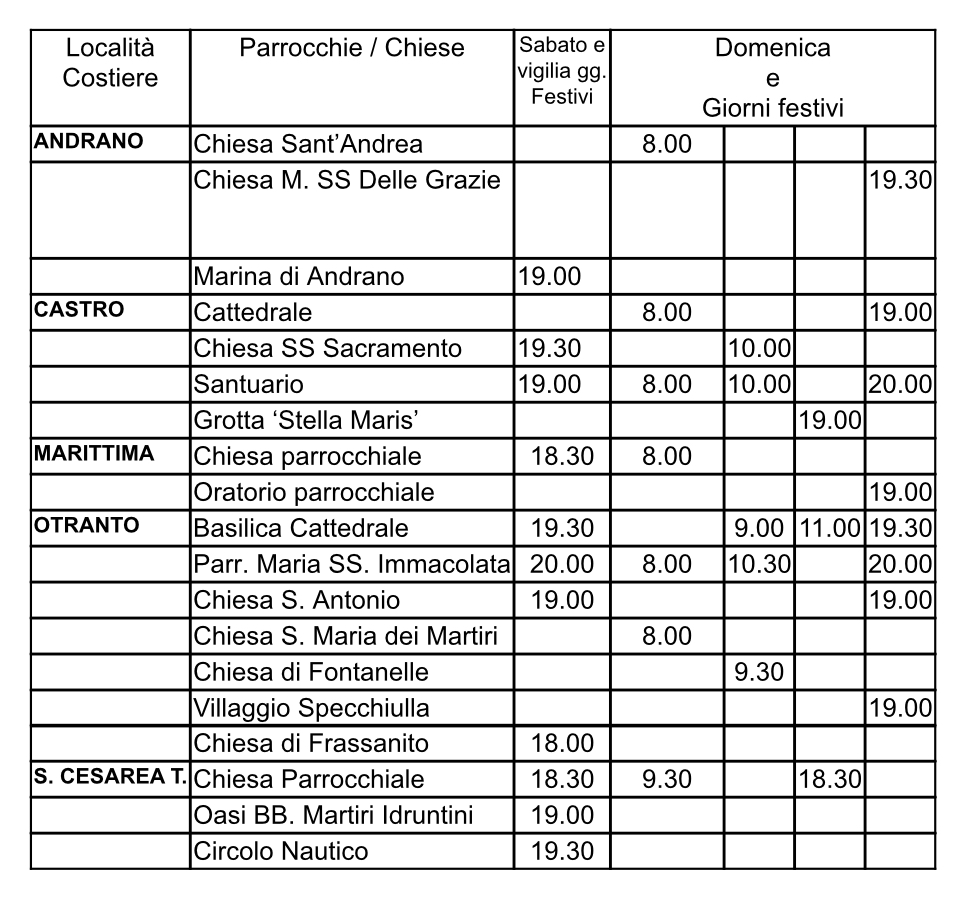 Orari delle Sante Messe nelle zone rivierasche dell’Arcidiocesi per l’estate 2024.