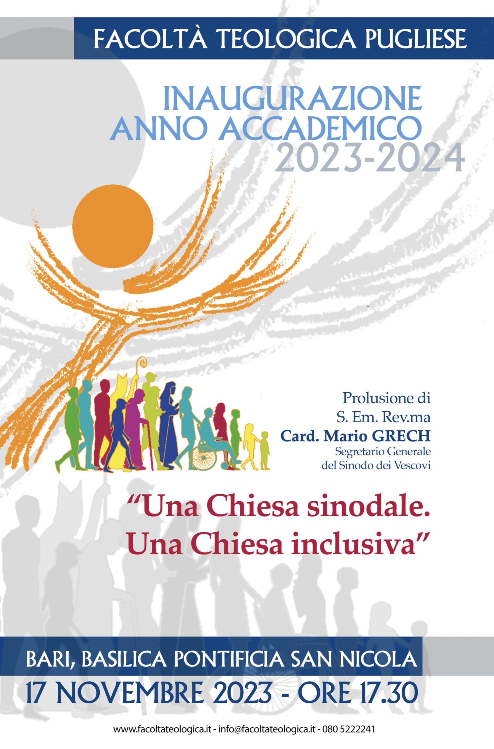 Il solenne atto accademico sarà preceduto dalla Celebrazione Eucaristica presieduta da S. Ecc. Rev. ma Mons. Giuseppe Satriano, Arcivescovo Metropolita di Bari e Gran Cancelliere della Facoltà Teologica Pugliese, nella Cattedrale di Bari alle ore 16:00. La Prolusione 📚 dell’Anno Accademico sarà tenuta da S. Em. Rev. ma Card. Mario Grech Segretario Generale del Sinodo dei Vescovi.