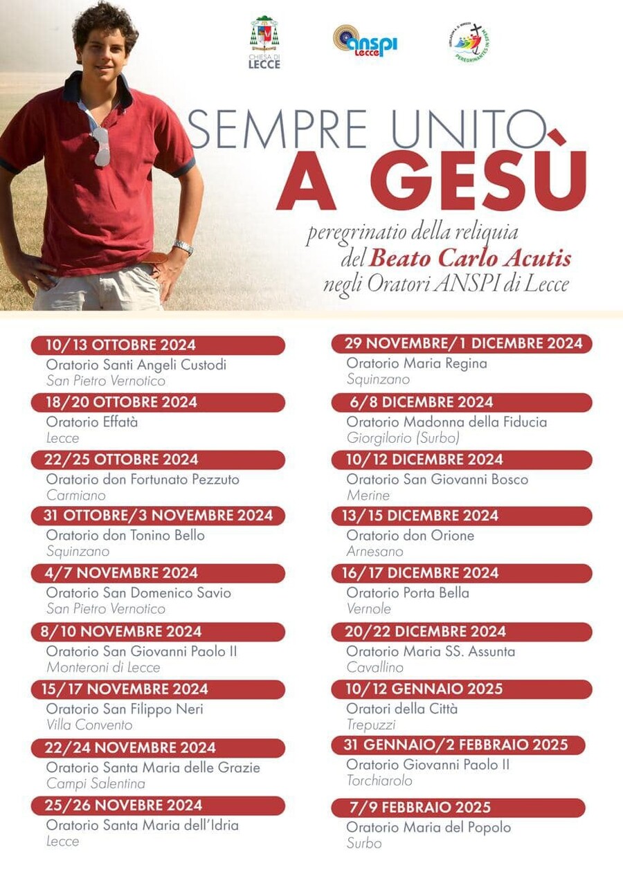 Ogni tappa del pellegrinaggio sarà un momento di preghiera, condivisione e riflessione, offrendo ai giovani la possibilità di avvicinarsi sempre più alla figura di Gesù, proprio come Carlo Acutis ha fatto nella sua breve ma intensa vita. Il calendario prevede una serie di appuntamenti in tutta la diocesi, tra cui tappe a San Pietro Vernotico, Carmiano, Squinzano e altre località, culminando nel mese di febbraio 2025.