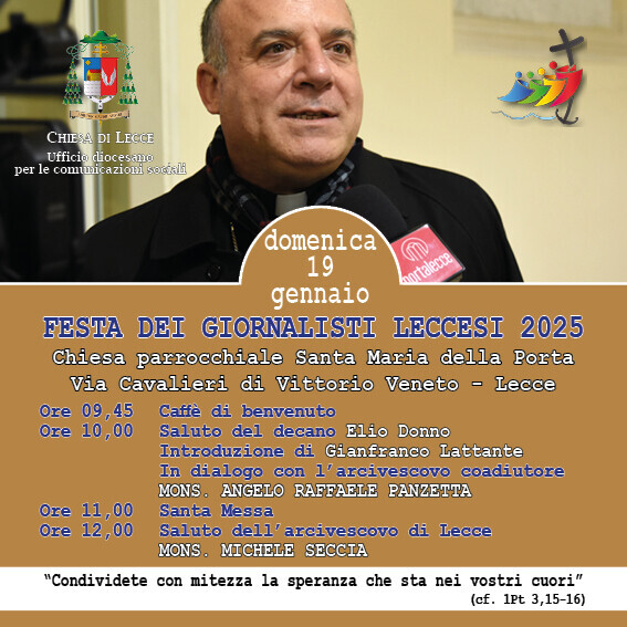 Dopo il saluto del decano dei giornalisti salentini, firma storica del Corriere dello sport, Elio Donno, Gianfranco Lattante, direttore del telegiornale di Telerama, introdurrà e inviterà i giornalisti presenti al dialogo con mons. Angelo Raffaele Panzetta, da pochi mesi arcivescovo coadiutore di Lecce. Un momento di fraterna condivisione per una conoscenza reciproca.