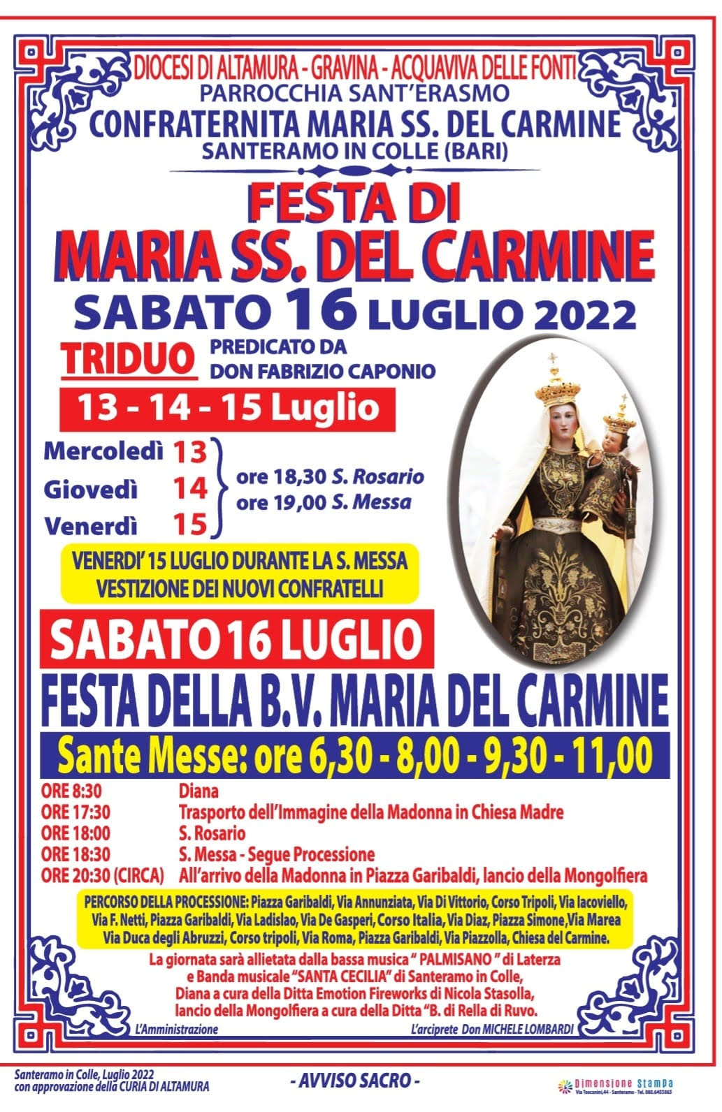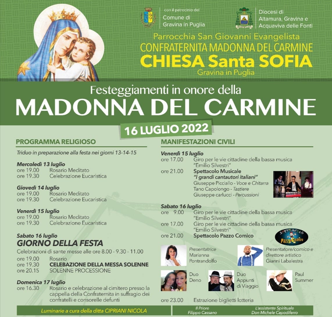 Sabato 16 Luglio 2022, nelle città della Diocesi di Altamura – Gravina – Acquaviva delle Fonti, si celebra la Beata Vergine del Carmelo.