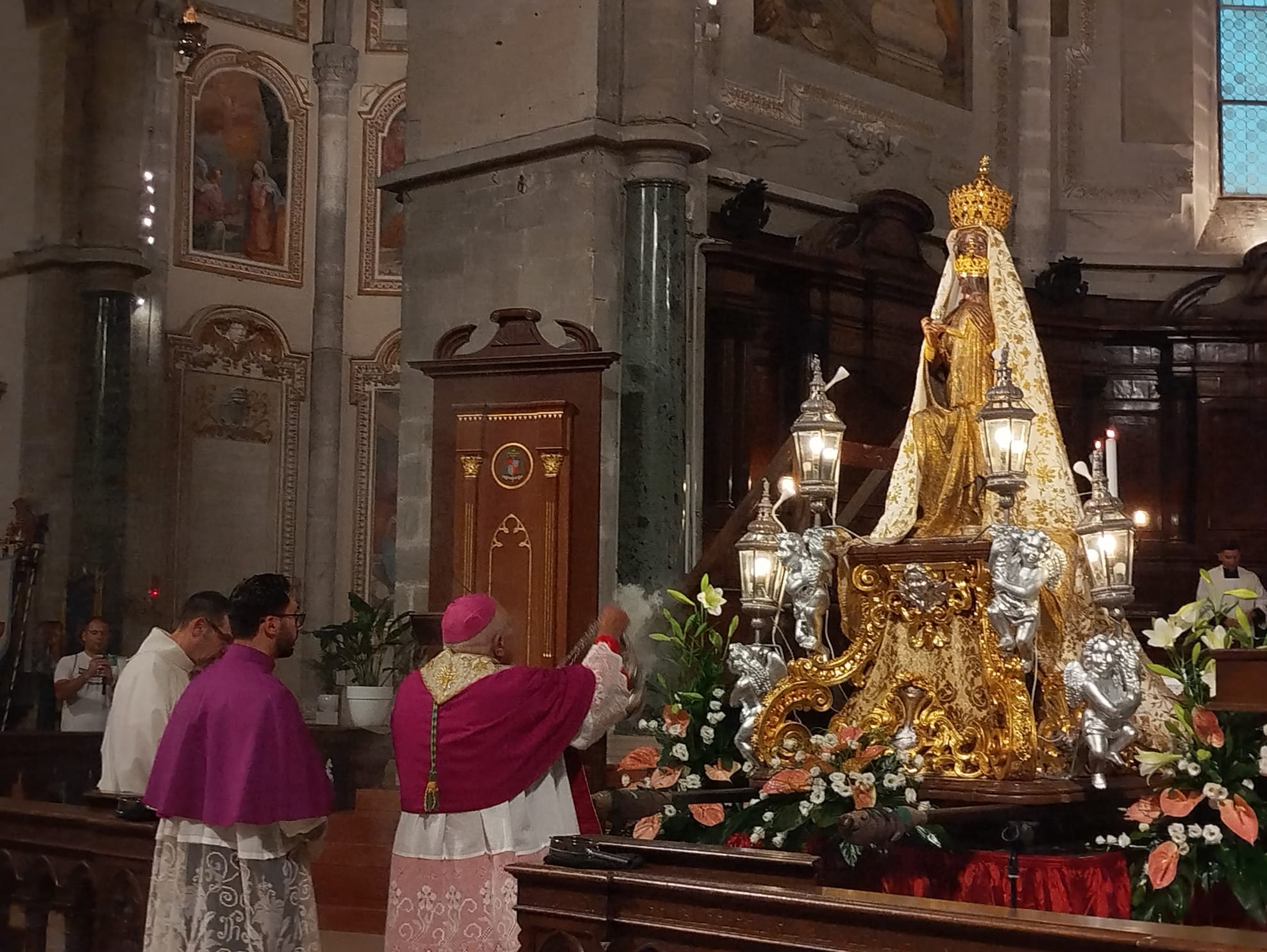 Dopo la celebrazione dei Primi Vespri nella Cattedrale, si è svolta la consegna delle Chiavi a Santa Maria Patrona, seguita dalla processione storica in Piazza Duomo, cornice di una partecipazione viva e ordinata, come ogni anno.