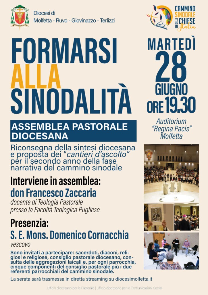 Martedì 28 giugno, presso l’auditorium “Regina Pacis” in Molfetta alle ore 19.30, si svolgerà l’Assemblea Pastorale Diocesana durante la quale verrà riconsegnata la sintesi diocesana del cammino sinodale, inviata alla CEI, e saranno fornite le indicazioni per la fase narrativa (secondo anno).