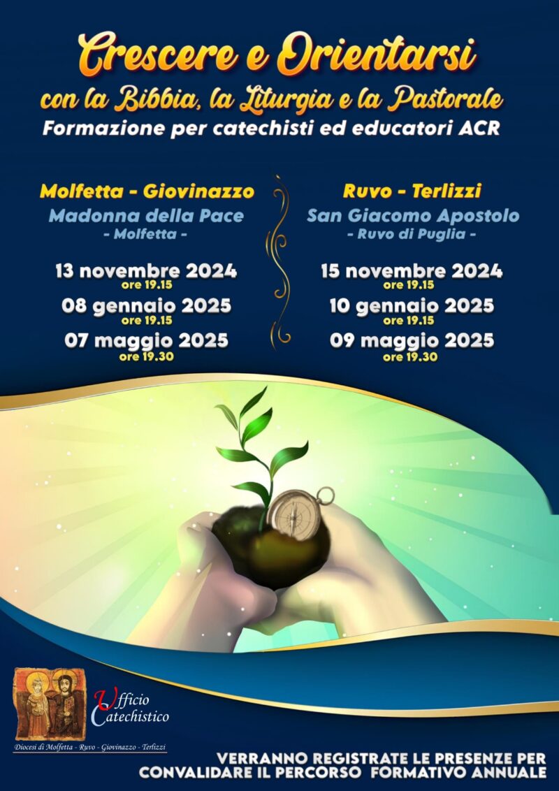 L’ufficio catechistico diocesano offre un percorso di formazione di base rivolto a chi svolge il servizio catechistico o desidera approfondire le conoscenze necessarie per migliorare le proprie competenze e promuovere una crescita personale e comunitaria. Questo programma si fonda sulle indicazioni della lettera “Una bussola per iniziare alla vita di fede“, indirizzata ai catechisti di Puglia.