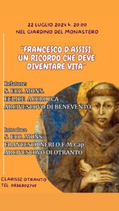 Il 22 luglio alle ore 20.00, nel Giardino del Monastero delle Clarisse di Otranto, un momento di riflessione su San Francesco d’Assisi.