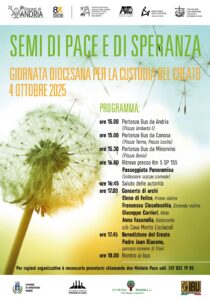 L’Ufficio di Pastorale sociale e lavoro, giustizia a pace e salvaguardia del creato, la Caritas diocesana, l’Ufficio per la Pastorale della salute e l’Ufficio per l’ecumenismo e il dialogo interreligioso, facendo seguito alla Giornata nazionale per la Custodia del Creato dello scorso 1° settembre, organizzano la GIORNATA DIOCESANA PER LA CUSTODIA DEL CREATO 2025. Tale momento si celebrerà il giorno Sabato, 04 ottobre 2025 alle ore 16.00 in zona Monte Lisciacoli – Minervino Murge