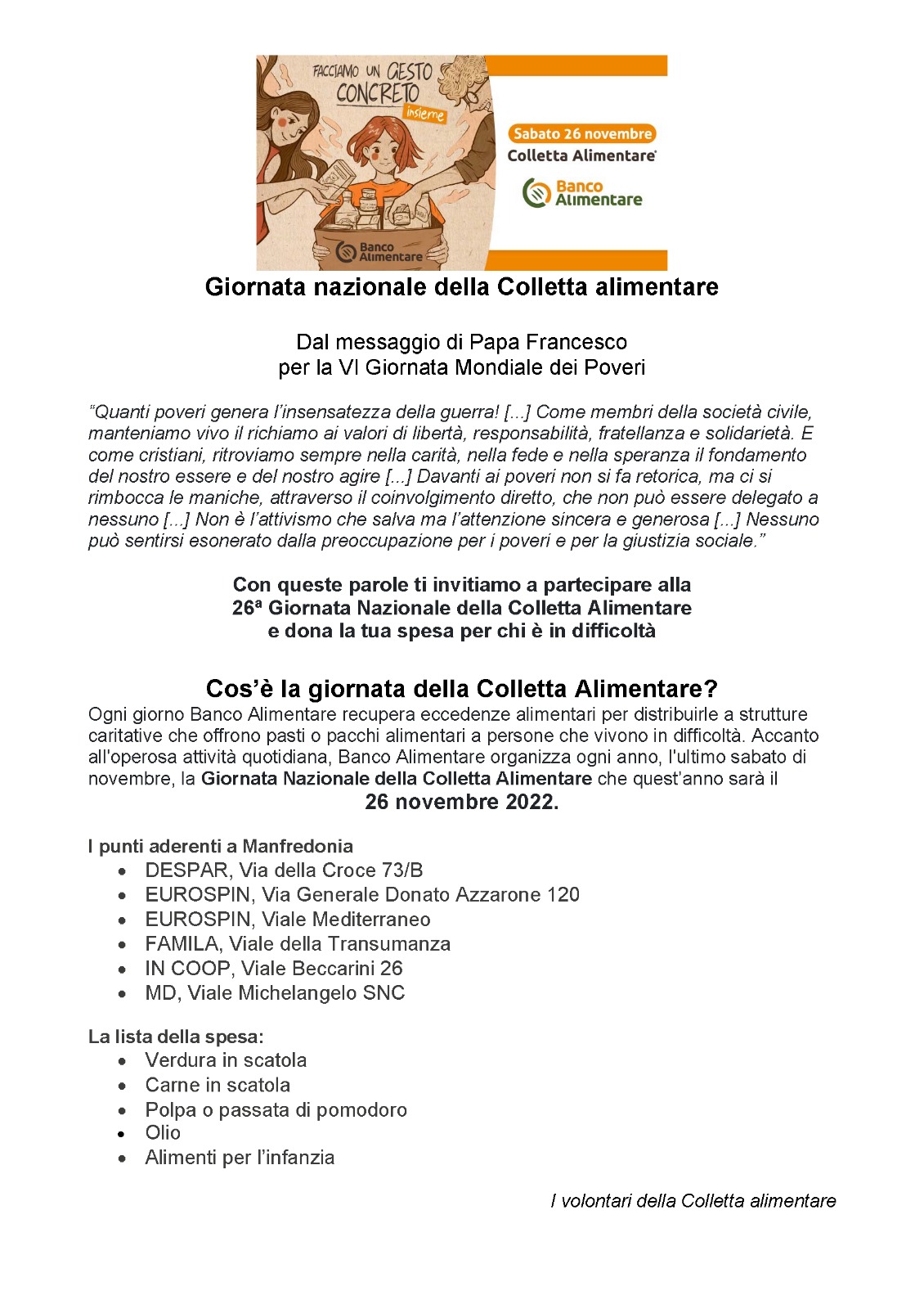 dioc. Manfredonia Giornata nazionale della Colletta alimentare – Arcidiocesi di Manfredonia – Vieste – San Giovanni Rotondo 25 Novembre 2022 0 31 Giornata nazionale della Colletta alimentare – Arcidiocesi di Manfredonia – Vieste – San Giovanni Rotondo Skip to content clic qui per l’articolo sul sito diocesano ARTICOLI CORRELATIALTRO DALL'AUTORE RETE INTERNAZIONALE “PRETI CONTRO IL GENOCIDIO” – Lettera aperta ai Vescovi Italiani in occasione della preghiera per la pace ORDINAZIONE DI DON MICHELE COPPOLECCHIA – Arcidiocesi di Manfredonia – Vieste – San Giovanni Rotondo ORDINAZIONE PRESBITERALE DI DON ELISEO COSTANTINO – Arcidiocesi di Manfredonia – Vieste – San Giovanni Rotondo GIORNATA MONDIALE DEI POVERI – 2025 – Arcidiocesi di Manfredonia – Vieste – San Giovanni Rotondo Un voto per costruire Speranza e Fraternità – Arcidiocesi di Manfredonia – Vieste – San Giovanni Rotondo