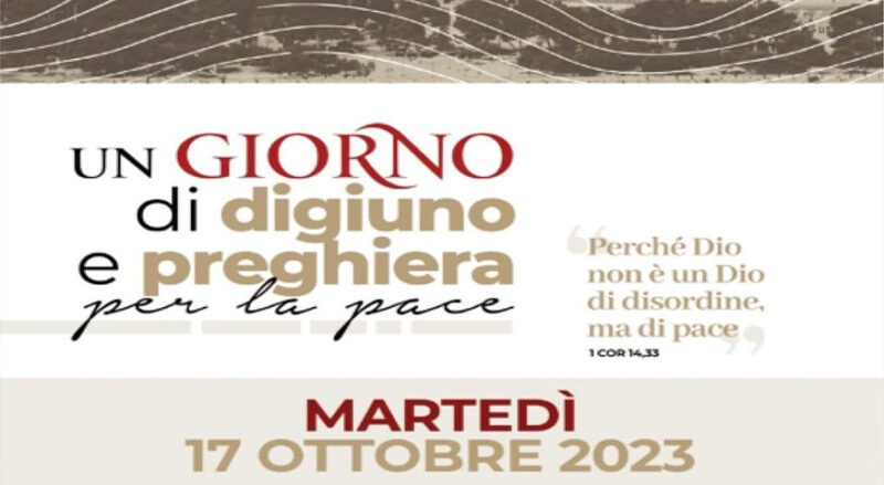 Pertanto, la Presidenza della C.E.I. ha deciso di promuovere una Giornata nazionale di digiuno, preghiera e astinenza per la pace e la riconciliazione. La data scelta è martedì 17 ottobre, in comunione con i cristiani di Terra Santa, secondo le indicazioni del Patriarca di Gerusalemme che, a nome di tutti gli Ordinari, ha chiesto alle comunità locali di incontrarsi «nella preghiera corale, per consegnare a Dio Padre la nostra sete di pace, di giustizia e di riconciliazione».