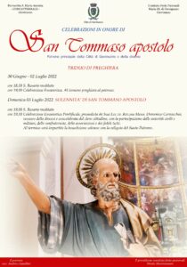 Domenica 3 luglio, solennità di San Tommaso Apostolo, alle ore 19.30 la Celebrazione Eucaristica presieduta dal vescovo Domenico Cornacchia e concelebrata dal clero cittadino, con la partecipazione delle autorità civili e militari, del comitato feste patronali, delle confraternite, delle associazioni e dei fedeli tutti. Al termine il vescovo impartirà la benedizione solenne con la reliquia del Santo Patrono.
