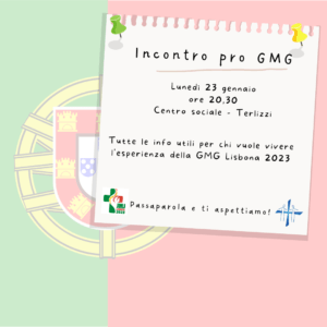 Per condividere le informazioni e i dettagli delle proposte diocesane, Il Servizio Diocesano di Pastorale Giovanile invita i responsabili dei gruppi e i giovani interessati ad un incontro “Pro GMG Lisbona” lunedì 23 gennaio alle 20.30 presso il Centro sociale “Sacro Cuore” in Terlizzi (Clicca per aprire la mappa).