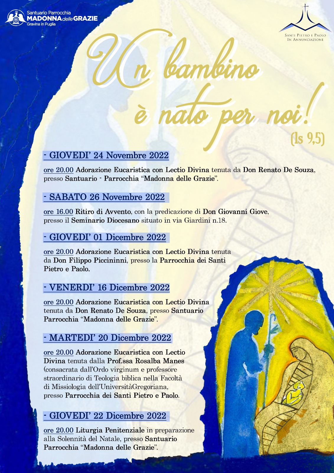 Questa sera, martedì 20 dicembre 2022, la chiesa SS. Pietro e Paolo in Annunciazione di Gravina in Puglia farà da cornice alla Lectio Divina curata dalla Prof.ssa Rosalba Manes, consacrata dall’Ordo virginum e professore straordinario di Teologia biblica nella facoltà di Missiologia dell’Università Gregoriana.