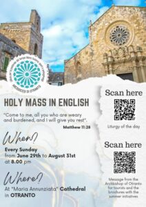 Ai turisti stranieri che trascorreranno il tempo estivo nella nostra Arcidiocesi, a partire dal 29 giugno sarà offerta la possibilità di partecipare all’Eucarestia domenicale celebrata in inglese, alle ore 20.00 nella Basilica Cattedrale di Otranto.