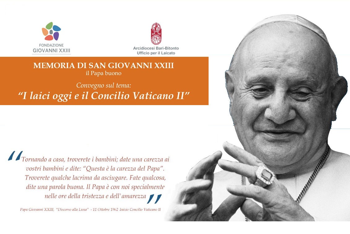 La Fondazione “Giovanni XXIII Onlus” e l’Ufficio per il Laicato dell’Arcidiocesi di Bari-Bitonto invita, mercoledì 11 ottobre 2023 alle ore 17.00, presso il Centro Alzheimer “Prof. D. Saracino” in Bitonto (Via Dossetti, 8), a partecipare al Convegno in Memoria di San Giovanni XXIII sul tema “I laici oggi e il Concilio Vaticano II”. Interverrà il Prof. Nicola Colaianni, Professore Emerito di Diritto Ecclesiastico.